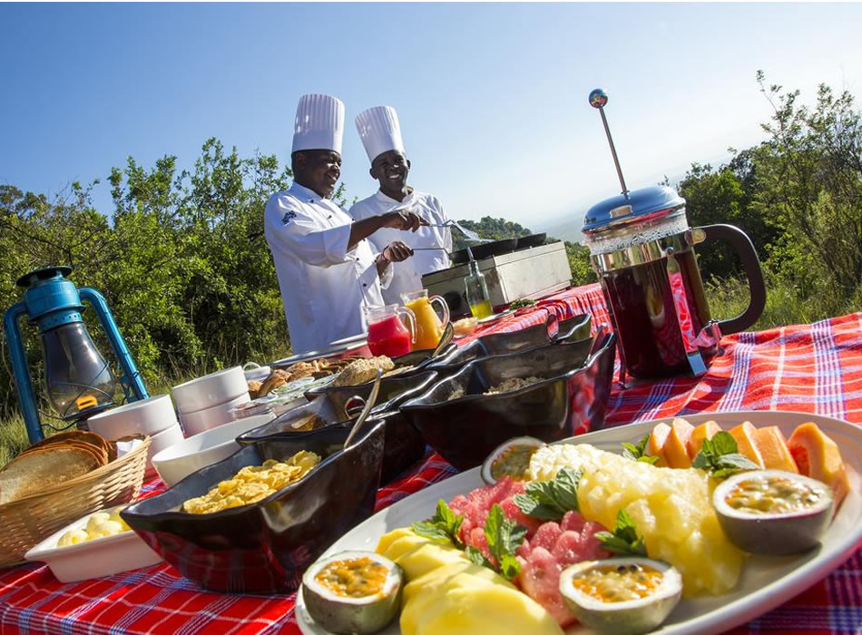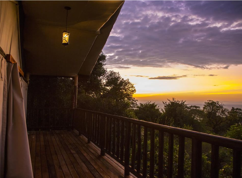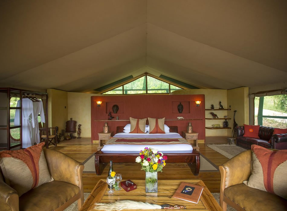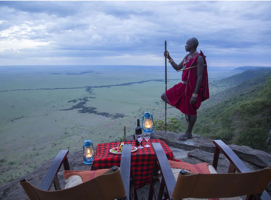 Mara Engai Lodge. Nestled amongst pristine Kenyan Ravine forest. Set 1000ft high on the Oloololo Siria Escarpment with 120 kms of breath-taking views over the famous Masai Mara Game Reserve and onto migration route overlooking into Serengeti. Features large, luxury, tented-suites and private viewing decks , walking safaris, bush dinners and bush breakfasts, sundowners, masai naming ceremony, learn how to make a fire like a masai, and picnics along with meals overlooking the entire Masai Mara.